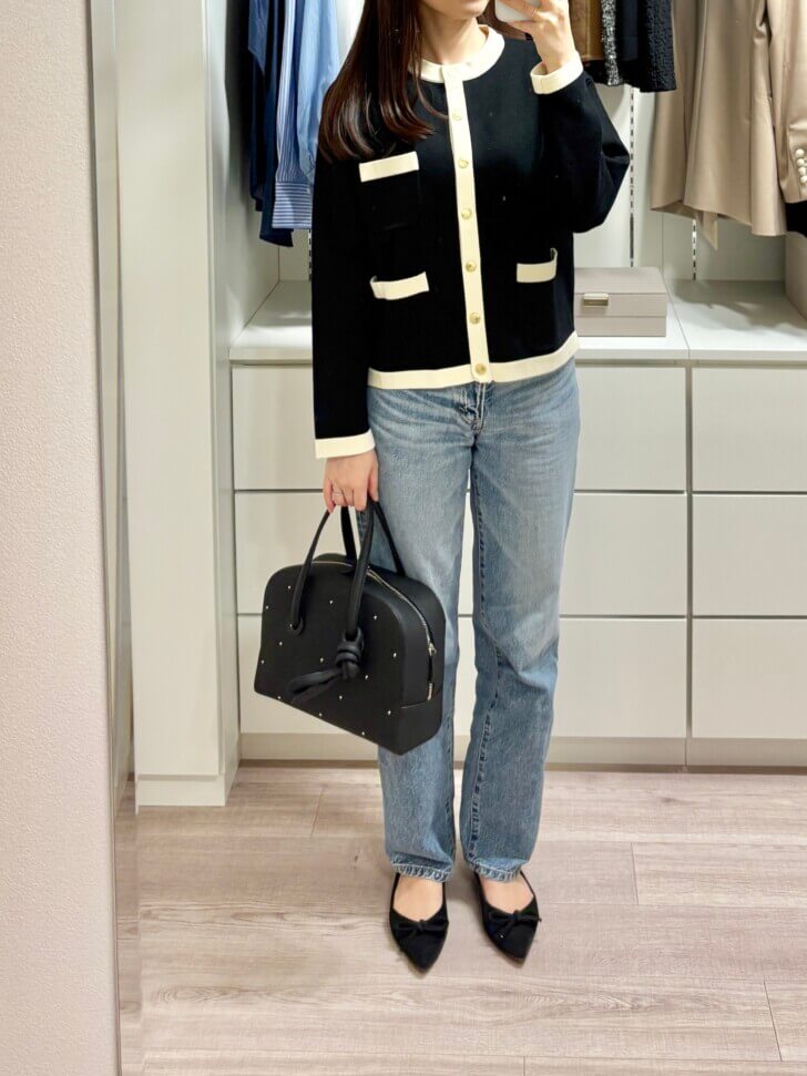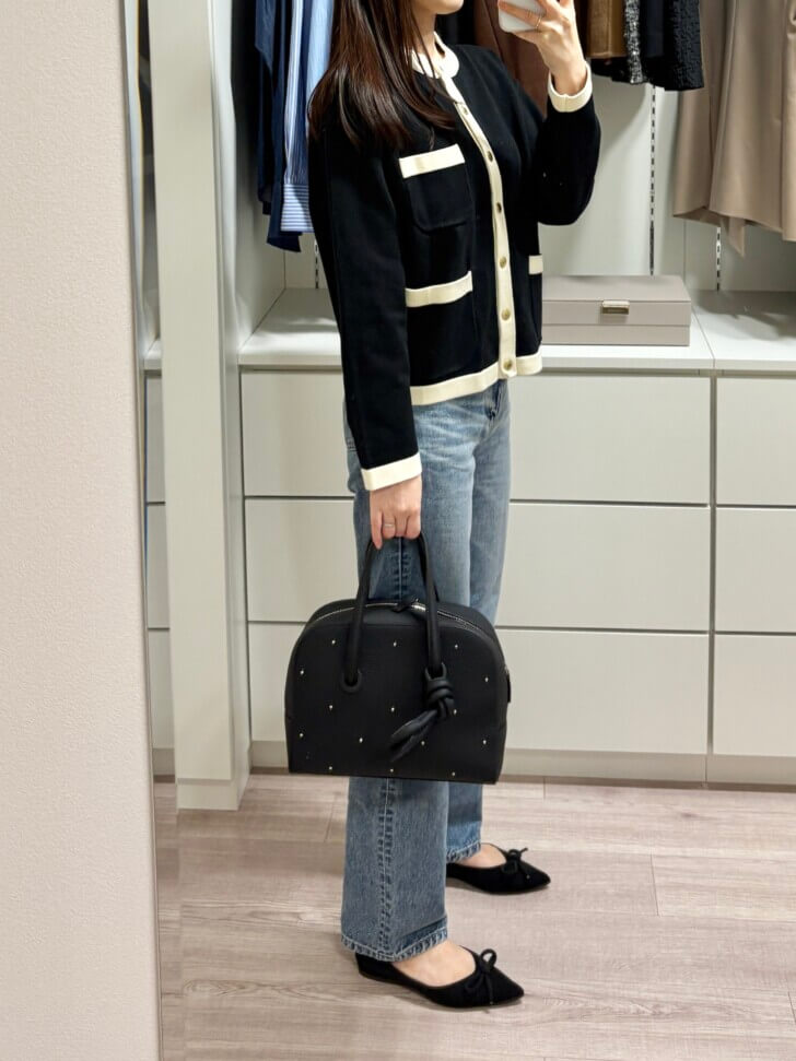 カーディガンとしても、前を閉めてトップスとしても使える短め着丈がいいよね。☺️