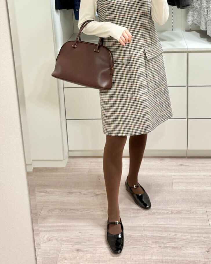 黒スカートに黒タイツでも良いけど、全身真っ黒になっちゃいそうな時はグレーにするとバランスよくなるね。🥰