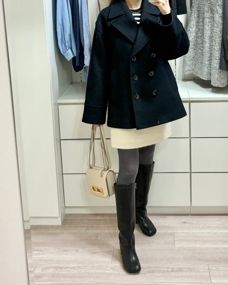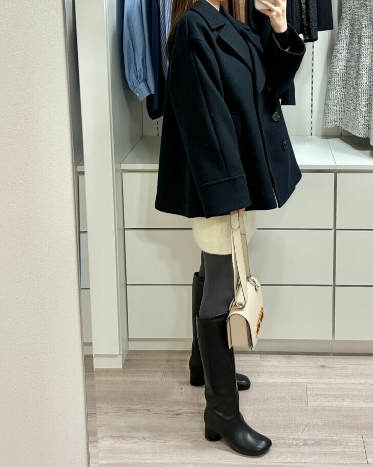 パンツにも合うけど、せっかく冬ならミニスカ✖️ブーツで合わせたい。