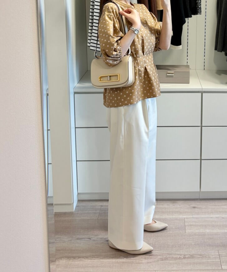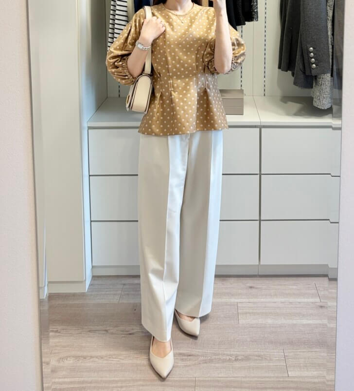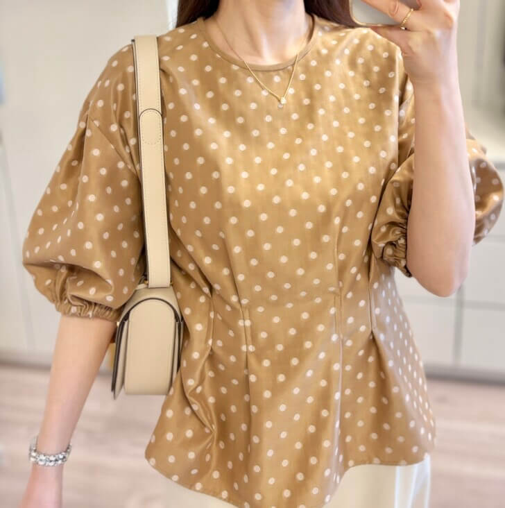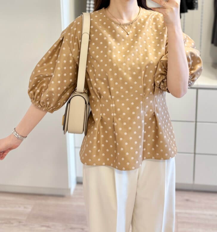 一目惚れしたドットブラウス。黒と迷ったけど顔映りがベージュの方が柔らかいのでこちらにしました。