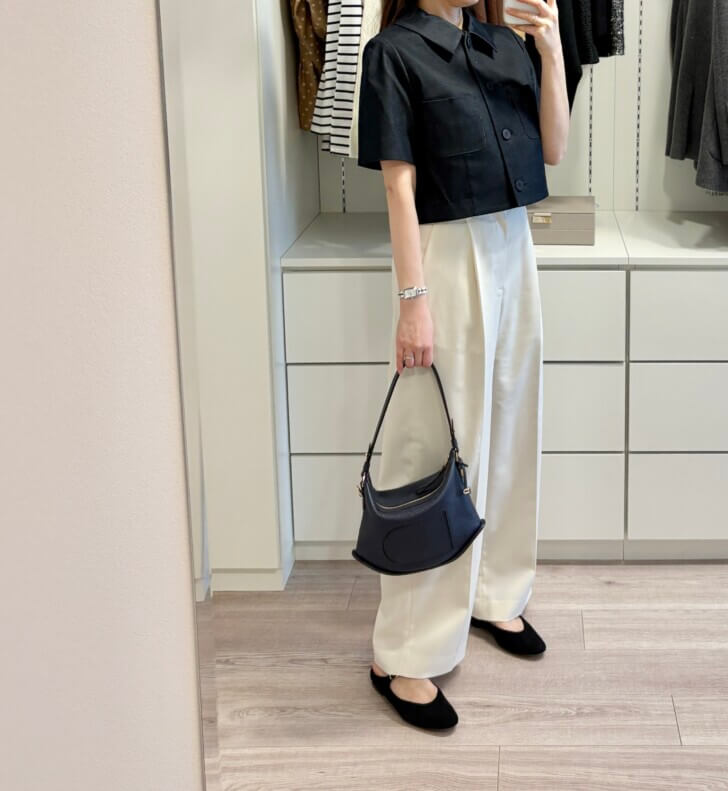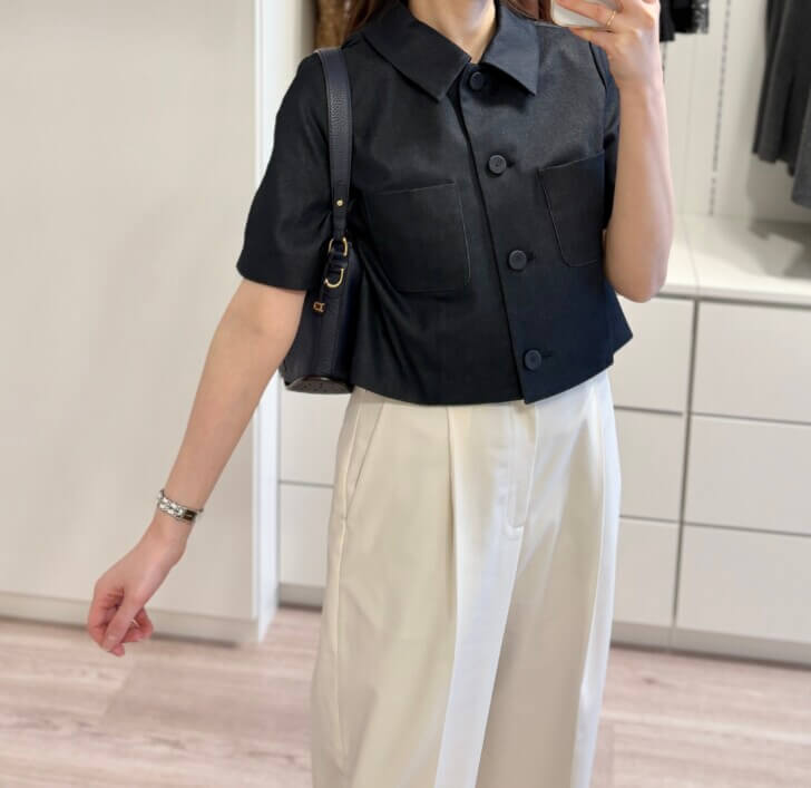着丈短めのジャケットは昔から大好きで、私の体型にぴったりハマります。