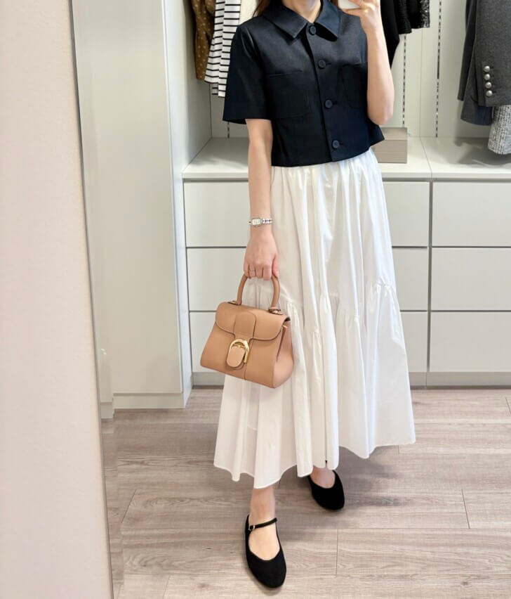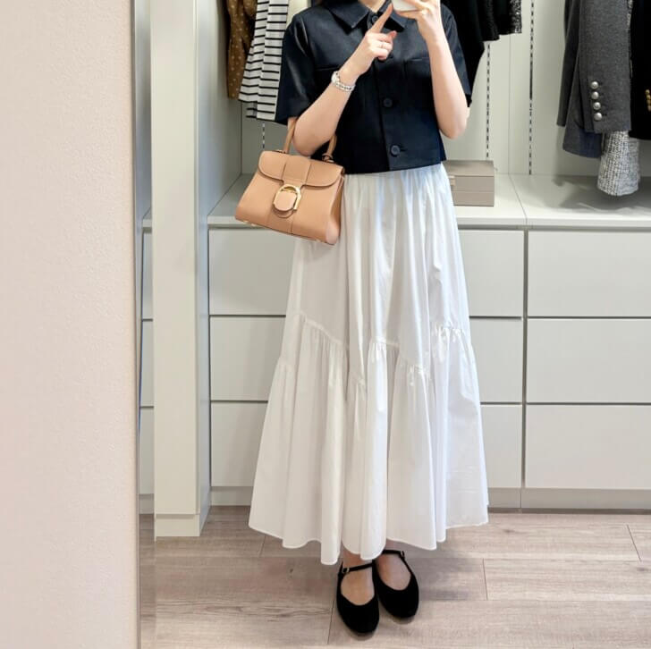 ロングスカートはなるべく良い生地のものを選びます。体の半分を覆うから、安い生地だとチープ感が強くなってしまうので。