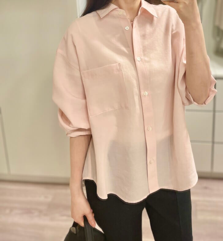 柔らかいピンク、少し透ける素材で、シャツだけど優しい雰囲気。